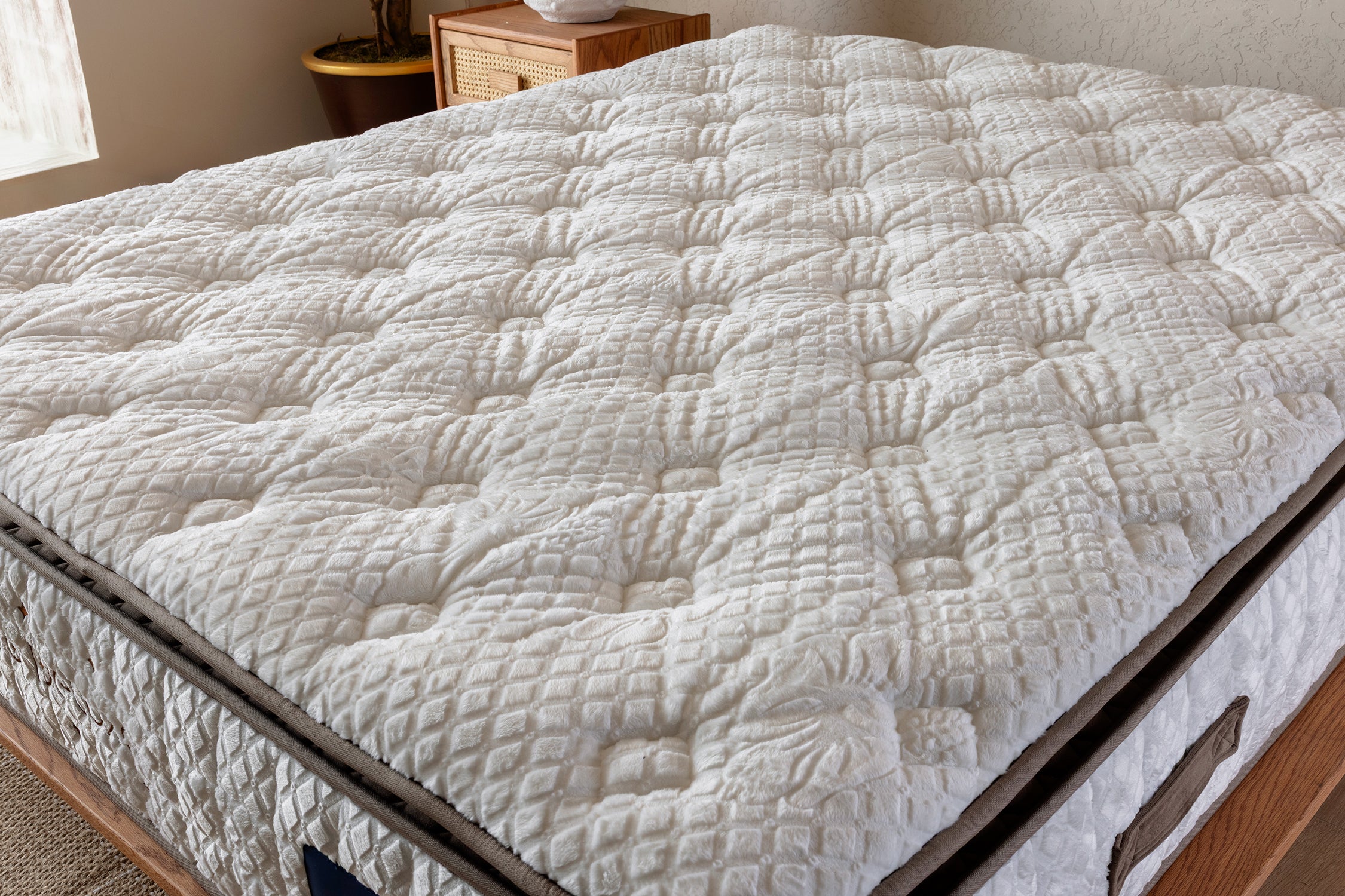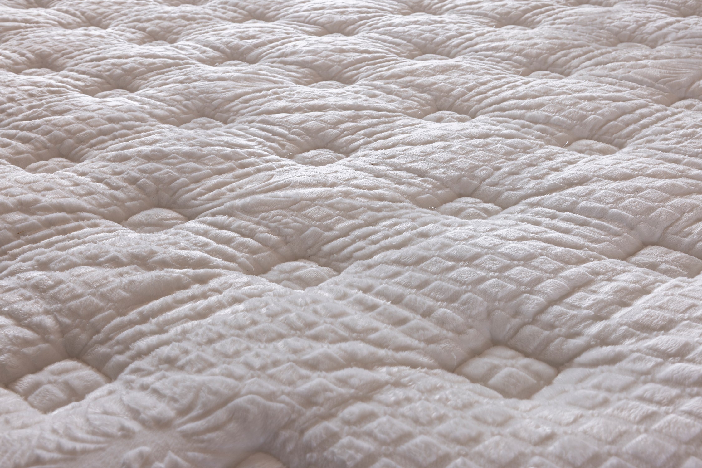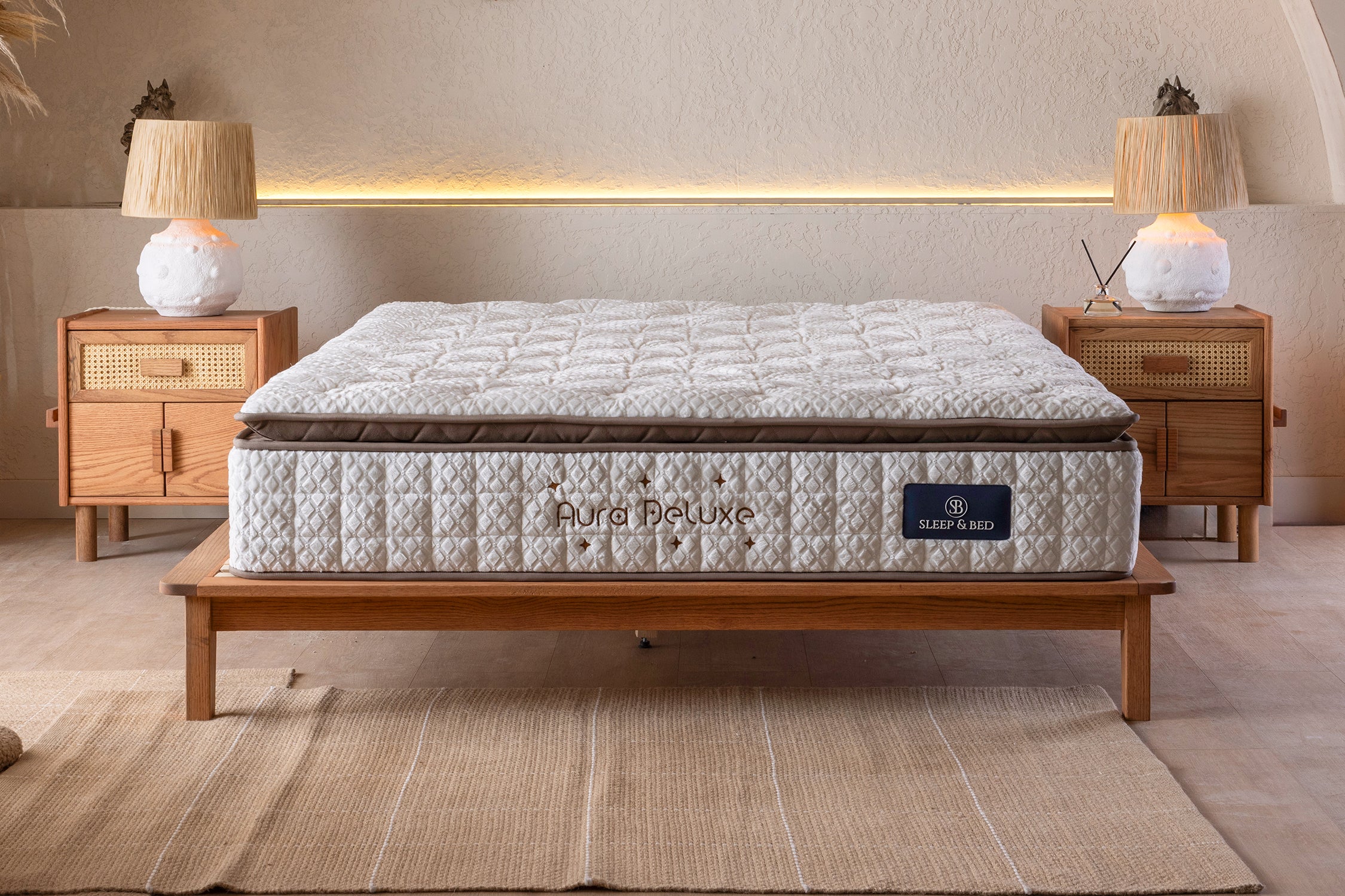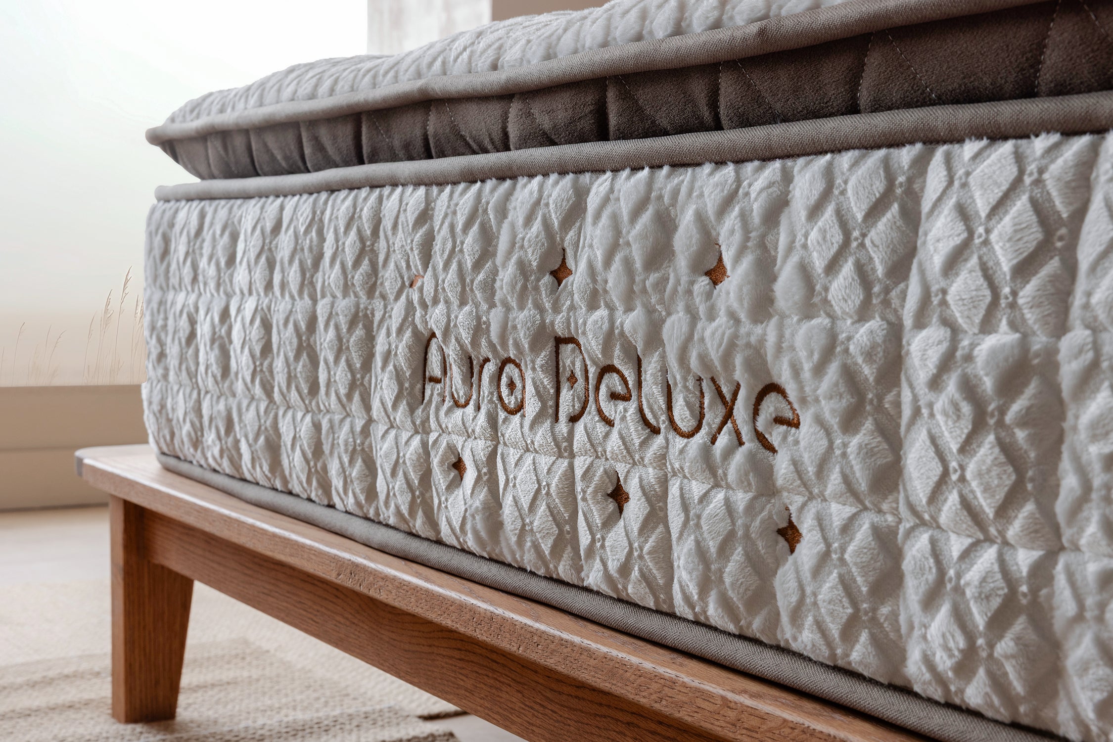 The Aura Deluxe mattress features a luxuriously soft fabric on the surface, designed with a faux rabbit fur texture. This fabric feels silky to the touch and does not retain heat upon contact with the skin, creating a cozy and calming sleep atmosphere. Its integrated pillow top adds volume and comfort, offering a plush sleeping surface.